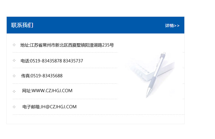 地址:常州市新北區友邦商務大廈1幢16、17層  電話:0519-85101652  傳真:0519-85112595  郵編:213022  網址:www_cz-jiayue_cn.mstdz.com  郵箱:xiajifengaa@163.com